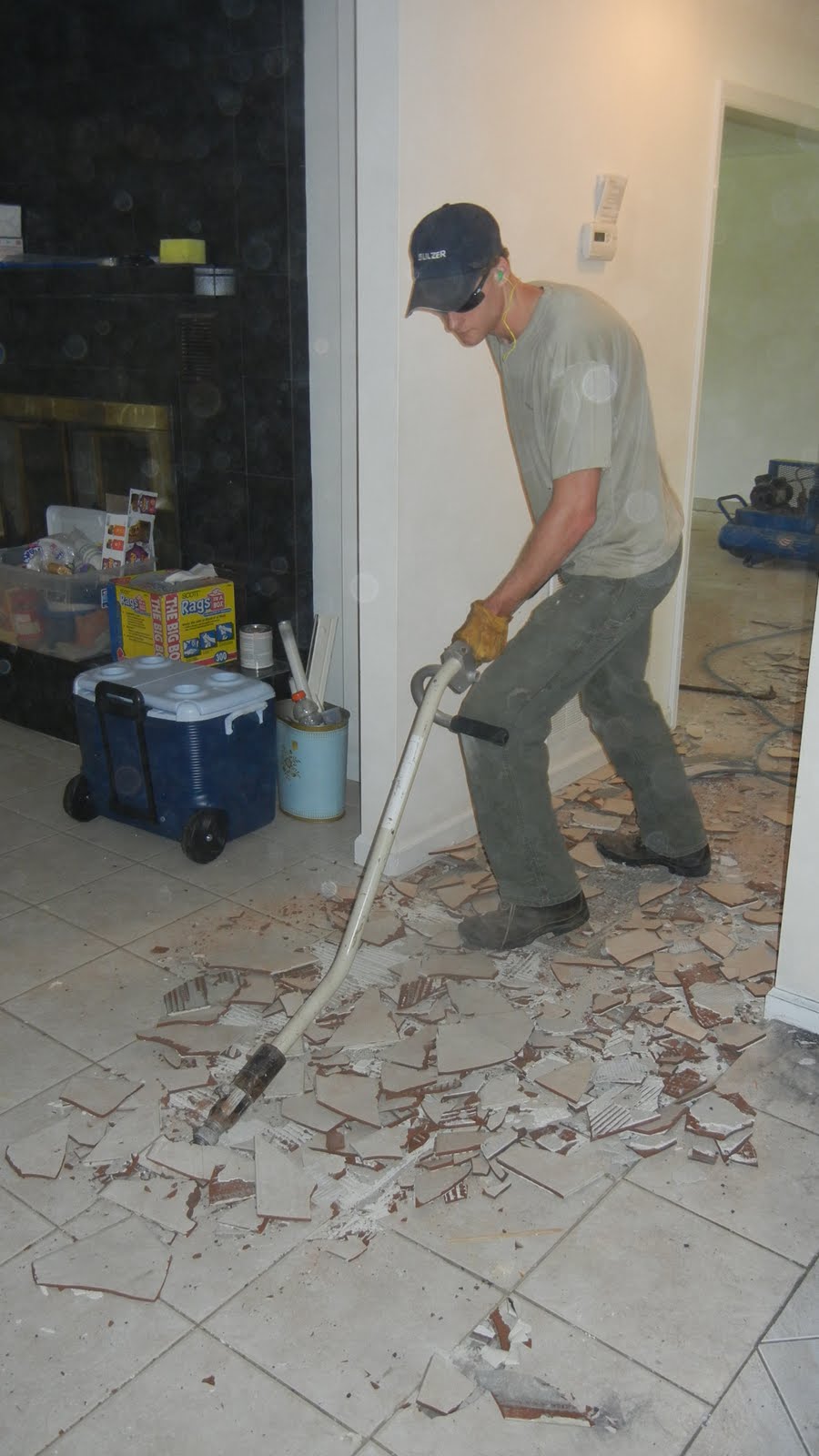 We have removed all of the cabinetry which we are going to re purpose in the garage. The sheet rock is down and the tile...what a pain....is UP~!
